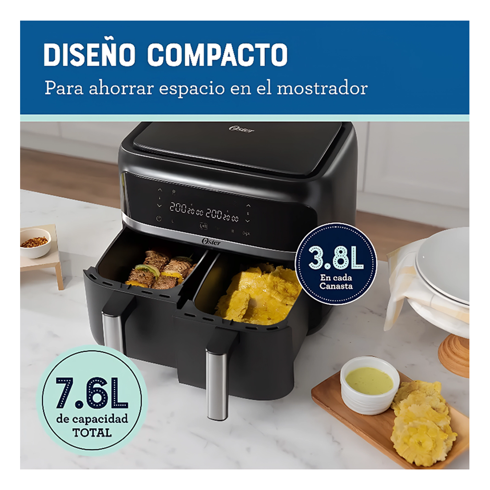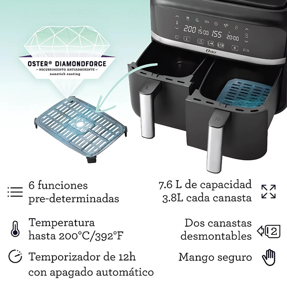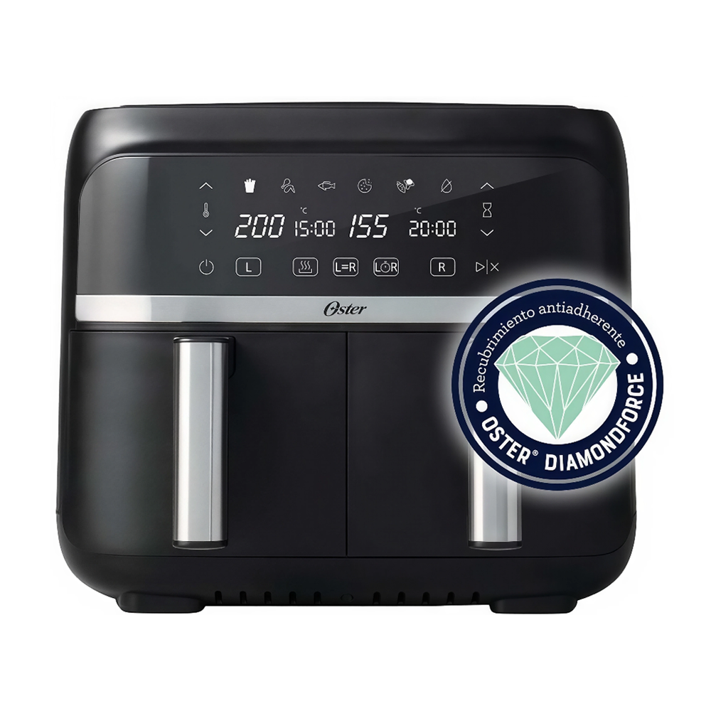 La Freidora de aire dual Oster® con recubrimiento DiamondForce es una freidora con dos canastas que permite cocinar dos platos de manera independiente. Cuenta con una capacidad total de 7,6L, distribuidos en 3,8L por cada canasta. Este electrodoméstico incluye un panel digital con 6 funciones preprogramadas para preparar papas fritas, carnes y aves, pescado, postres, vegetales y deshidratar. Las canastas vienen con bandejas extraíbles con recubrimiento antiadherente de Oster® DiamondForce, reforzado con partículas de diamante, lo que lo hace más duradero y resistente a rayaduras, así como más fácil de limpiar.